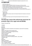 | DHSC Consultation document: Introducing a total online advertising restriction for products high in fat, sugar and salt (HFSS) A copy of this web page (as a pdf file) is available on this site. To access the consultation page, see: https://www.gov.uk/government/consultations/total-restriction-of-online-advertising-for-products-high-in-fat-sugar-and-salt-hfss. Consultation closes 22 December 2020. See also: UK: 10 November 2020 NUTRITION / ADVERTISING - New public consultation on total ban of online advertising for unhealthy foods Provided under the Open Government Licence. The original page was available at: here. |