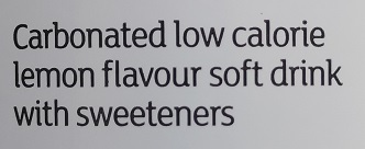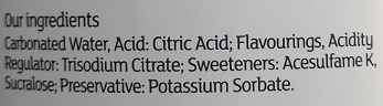 The following is an example of product where, because it has a food additive acting as a sweetener, the name of the food has to include reference to “sweetener” or “sweeteners”. The product is a Carbonated lemonade drink. First, here is the ingredients list which includes “Sweeteners: Acesulfame K, Sucralose”: