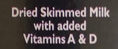 This example shows text from a tub containing Dried skimmed milk. In this case, the product has additional Vitamins A and D.