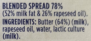 The figure below is part of the back panel for a Spreadable fat product showing both the product name and the ingredients. The legal name is “Blended Spread 78%” which meets the “sales description” specified in Appendix II in Annex VII of Regulation 1308/2013: