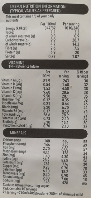 This second example below provides details on nearly all the optional vitamins and minerals. The data is taken from a powdered Meal replacement for weight control product: