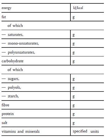 - Energy shall be declared in both kJ and kcal. Other nutrients to be declared in g except for vitamins and minerals the units used in the table of Nutrient Reference Values must be used (mg or mg) (see Table of vitamins and minerals)
