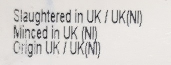 Under the requirements for minced beef, the pack must indicate where it has been slaughtered, where minced and its origin. In this case, the mincing took place in Northern Ireland, “UK(NI)”, but the beef may have its origin and have been slaughtered in other parts of the United Kingdom - hence the use of “UK/UK(NI)”. This is shown as follows: