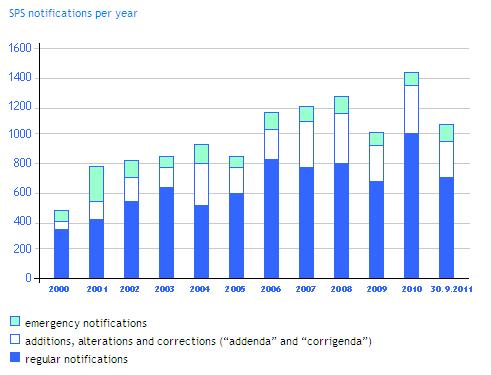 Overall, the volume is rising. The latest update of the WTO Secretariat report on notifications (G/SPS/GEN/804/Rev.4) says 2010 saw the largest number of notifications in a single year so far, at 1,436.