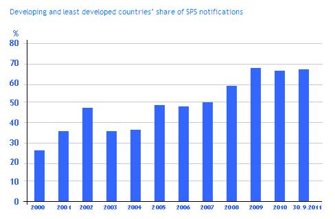 Developing countries (including least-developed countries) now submit more notifications than developed countries — they broke through the 50% share in 2008 and now contribute about two thirds of notifications each year.