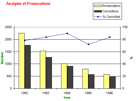 The number of prosecutions has dropped again and continues the trend of the last 5 years. At 572, it is now only 25% of the number taken in 1992. The conviction rate of 84% is in line with previous years. See Figure 1.